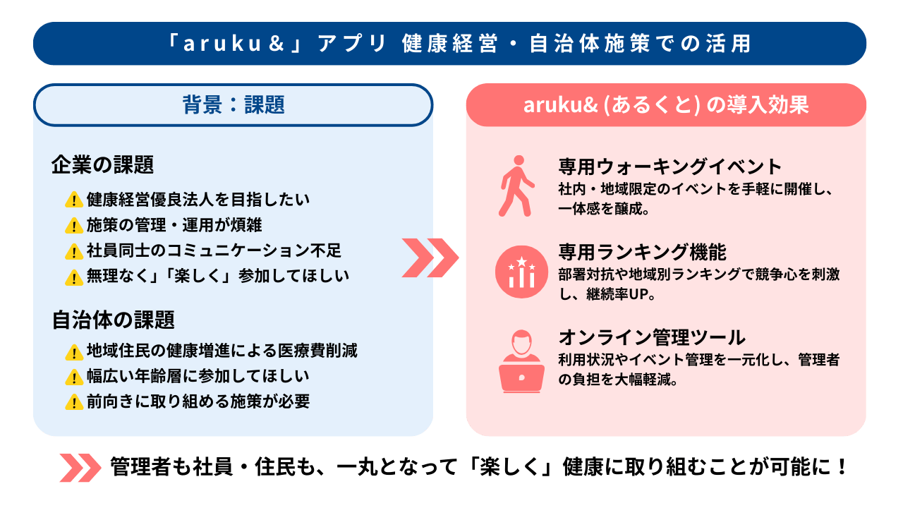 最近では健康経営に取り組む企業・健保組合や、地域の健康増進施策を行う自治体からの注目も集めており、実際に健康経営優良法人の認定に向けた一つの施策として採用されることも増えているといいます。 企業が「aruku&」を採用する背景には、健康経営優良法人を目指す上での施策管理の煩雑さの解消の課題や、社員同士がコミュニケーションを取りながら無理なく楽しんで参加してほしいという想いがありました。一方、自治体では、地域住民の健康を向上させることで医療費の削減につなげたいという目標があるため、幅広い年齢層に前向きに取り組んでもらう必要がありました。