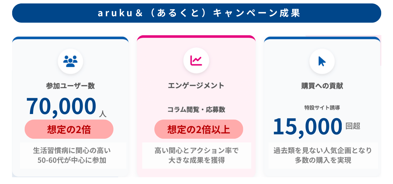 「aruku&」では健康食品メーカーをはじめとした企業とのタイアップ企画を実施しており、健康意識の高い利用者に向けた健康商品の紹介の場としても活用されています。 そんな中、2025年4月から5月にかけて、オムロンヘルスケア社とのタイアップ企画が実施されました。この企画では、体重測定と歩数達成、オムロンヘルスケアの健康コラムを読むというミッションを達成していくことでオムロン体重体組成計が抽選で当たるというものです。また同時に、オムロン特設サイトで体重体組成計を購入した方へ向けたプレゼントキャンペーンも実施されました。